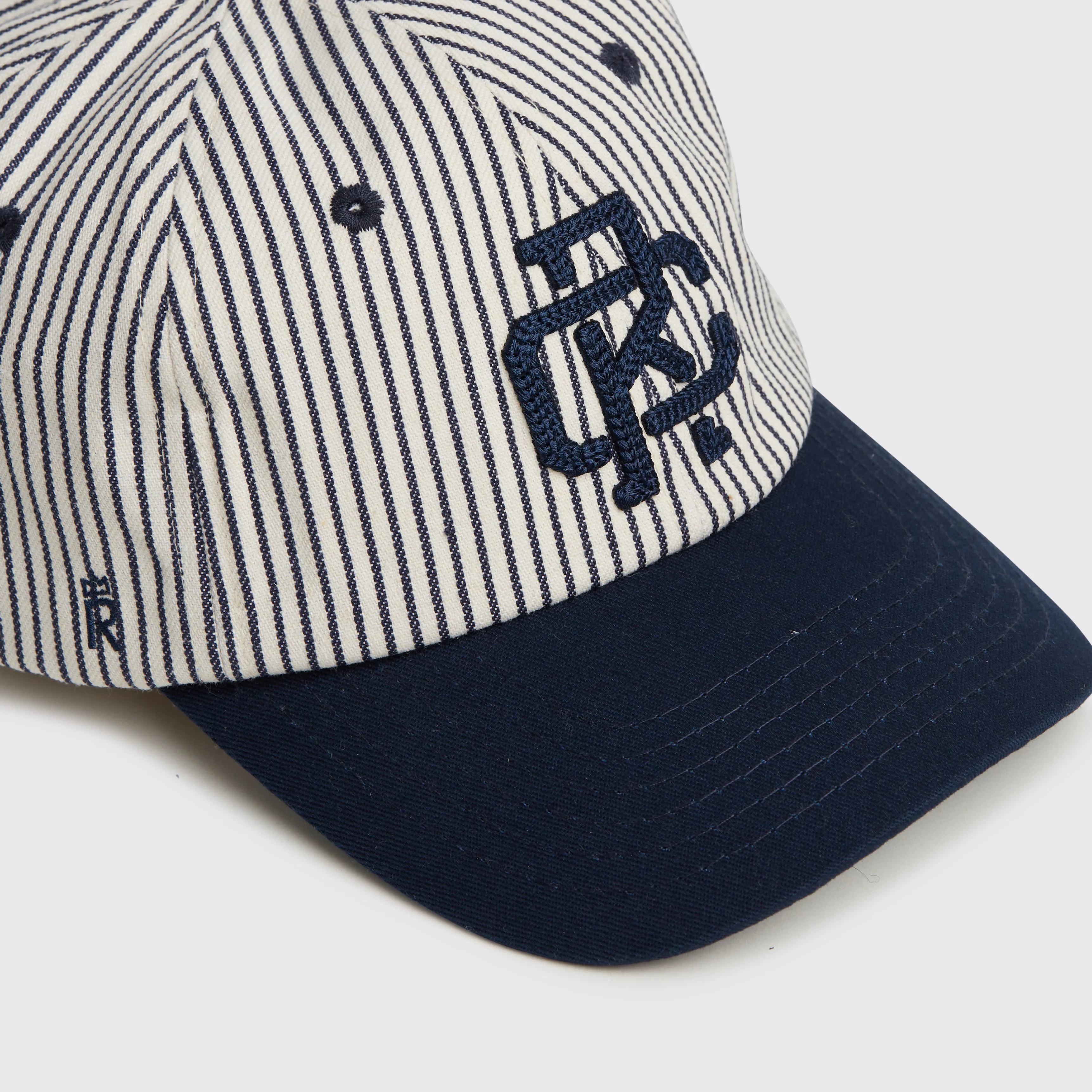 Rex Club | The RC – Baseball Pin – SS26 Navy features a white crown with thin navy vertical stripes, a navy brim and eyelets, and a dark blue embroidered monogram logo on the front. | Custom Caps | Custom Hats | Team Headwear | UK